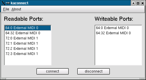 "72:0 External MIDI 1" shows the name "MidiSport 2x2 Port A"